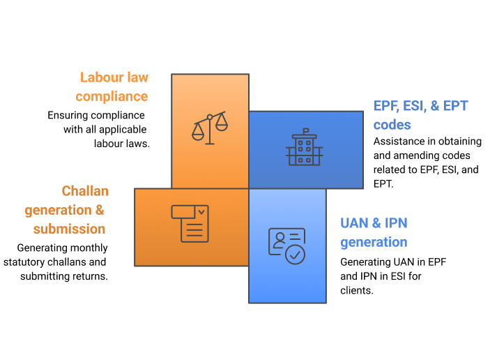 We help our clients with a wide range of statutory related activities including obtain/amend EPF, ESI, & EPT codes &generation of UAN in EPF, insured (IPN) in ESI and Generation of Monthly Statutory Challans and submission of returns and remain compliant with all labour laws.